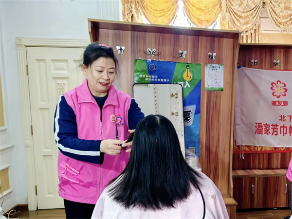 2023年,潘家芳带领巾帼志愿服务队推出“关新小哥”品牌系列公益活动,每月定期为新业态新就业群体举办一次义务理发,用实实在在的关心,为新业态新就业群体营建更多的“爱心”港湾。