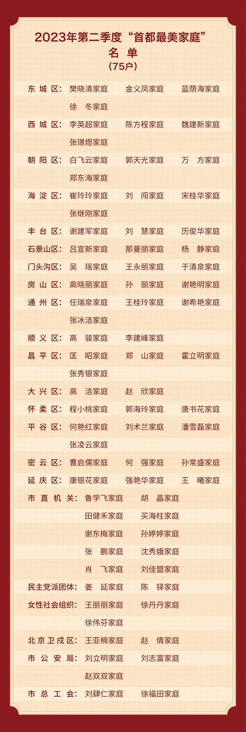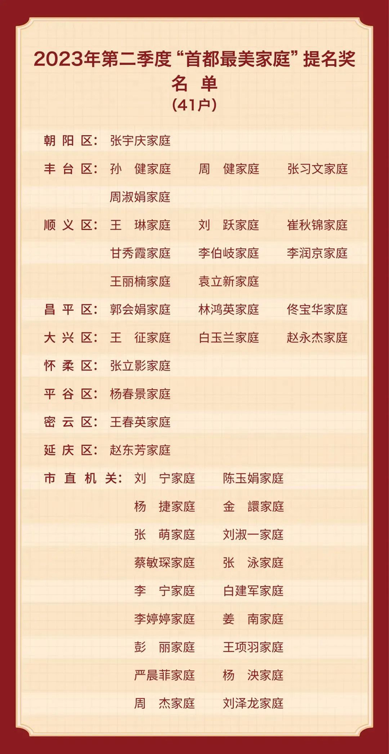 据悉,为深入宣传贯彻落实党的二十大精神,全面落实习近平总书记关于注重家庭家教家风建设重要论述,2023年寻找“首都最美家庭”活动以“激扬家国情 奋斗新征程”为主题,重点选树爱党爱国、绿色环保、科学教子、廉洁齐家、孝老爱亲、移风易俗等家庭典型,弘扬新时代家庭观,营造和谐和睦、向上向善的家风文化,以“小家”的文明共筑“大家”的和谐。