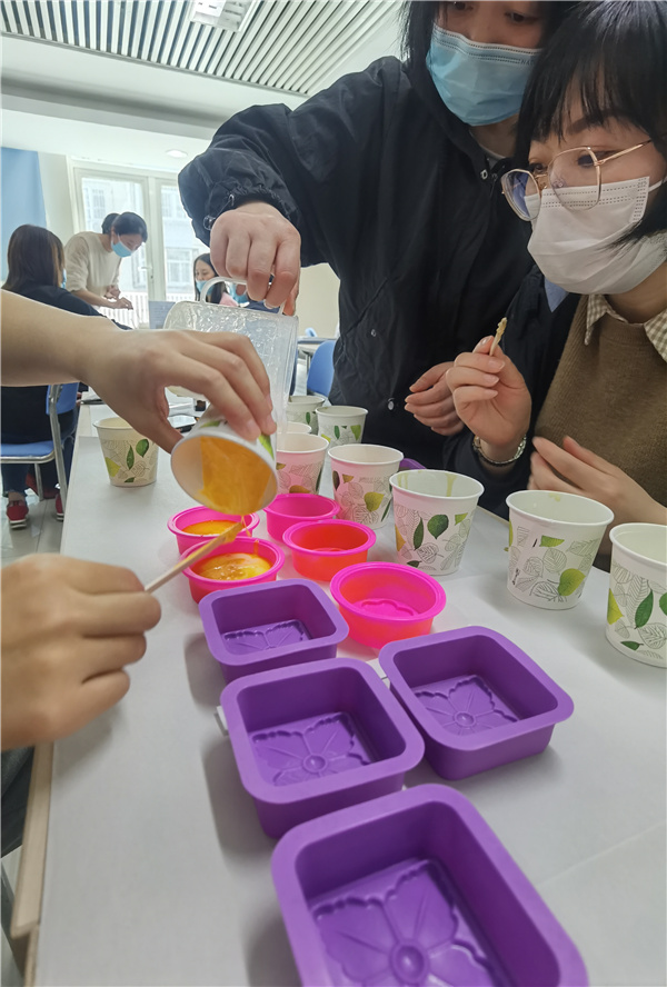 培训中老师先为大家讲解了抗菌精油皂的原料来源及功效、制作的过程、注意的事项等要点,学员们在老师指导下一步步实践,从皂基、精油、植物粉等材料开始,经过加工、混合、制作,最后一块块精致的天然精油抗菌皂展现在大家面前,女性特质十足的手作产品赢得了在场学员的一致喜爱。