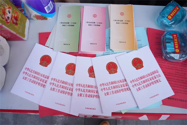 来往园区的女职工们围拢在普法宣传台前,咨询妇女权益保护、女职工劳动保护等方面的问题,巾帼律师结合典型案例,耐心进行细致解答。