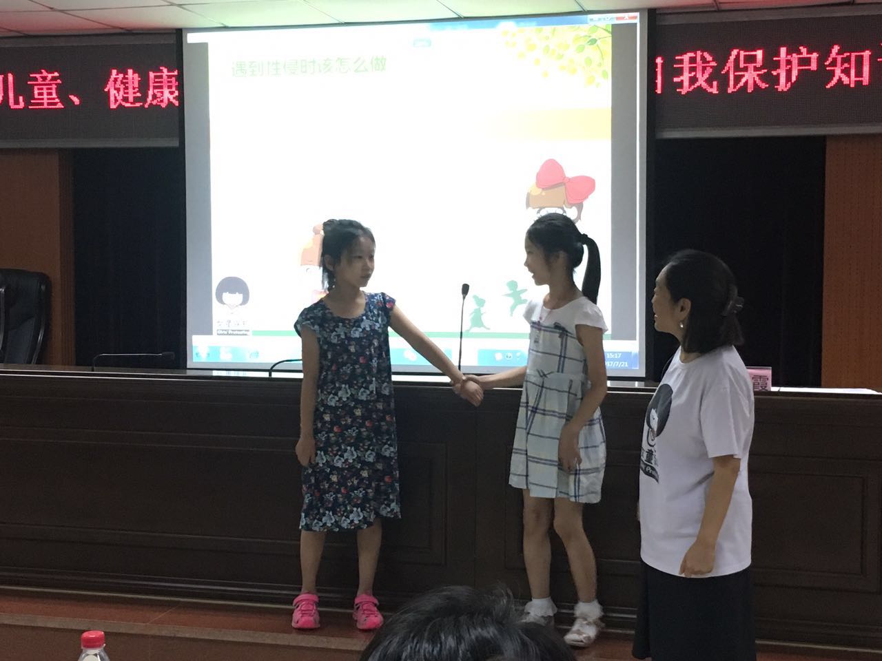 来自青少年基金会的韦燕霞老师,用质朴的语言,告诉孩子们要学会保护自己的身体,哪些是隐私部位,不能让其他人看、碰的部位;教会孩子分辨哪些是友好的身体接触,哪些是恶意的;让孩子们树立起防范意识,同时也教会孩子在遇到侵犯时,应该怎样来保护自己。孩子们也都积极的参与到与老师的互动中,老师让孩子通过现场模拟的方式,大胆的喊出:“我不认识你,你不要碰我”,“我没有到14岁,你想坐牢么”等在遇到危险时,自我保护的话语,让孩子充分的掌握,保护自己的方法。